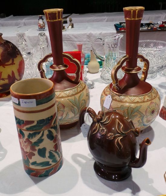 A pair of Old Hall pottery ball and shaft vases in the aesthetic style, 22 cms , a Brameld Cadogan teapot , brown glaze with applied sprays and a Spanish cylindrical vase 25 cms (4)