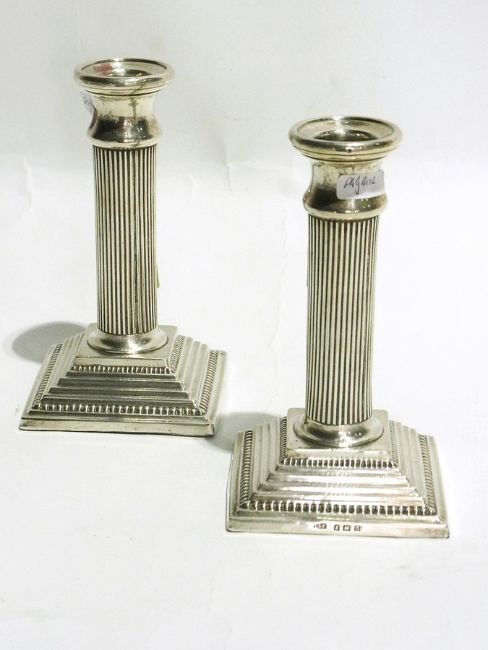 Pair of early 20th century silver column candlesticks on stepped bases, Birmingham 1911