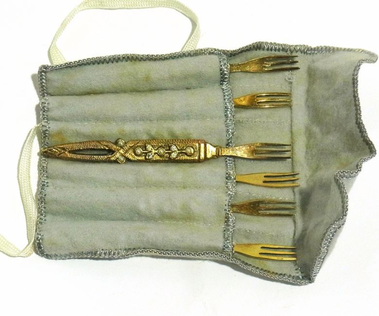 Three pairs of miniature silver forks together with gilt metal set of six miniature forks with seedpearl inlay