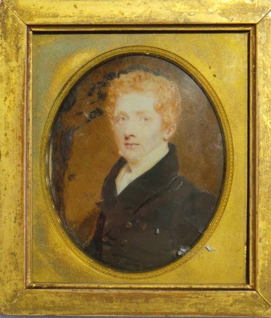 19th century miniature on ivory, half-length portrait of gentleman, 9cm x 7cm and a George Baxter colour print of young lady on terrace (2)