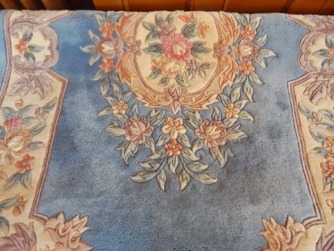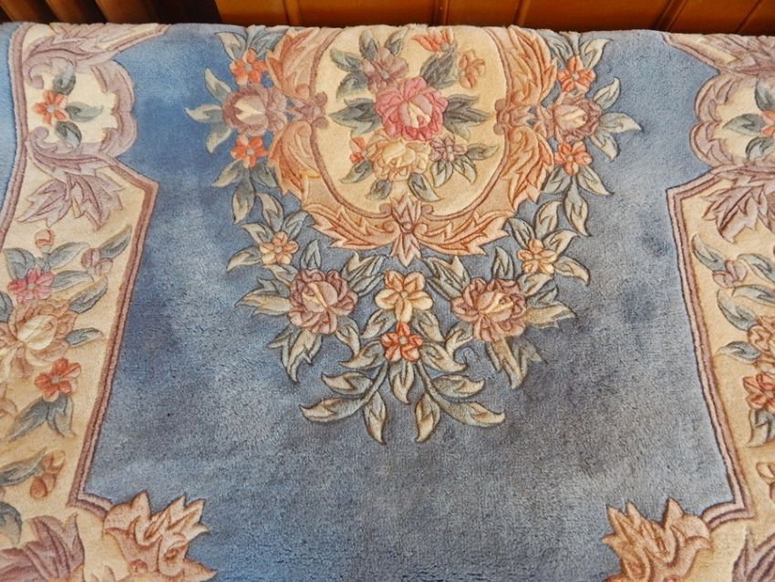 Chinese wool rug, pale blue ground with cream central motif and shaped borders, 120 x 190 cms