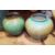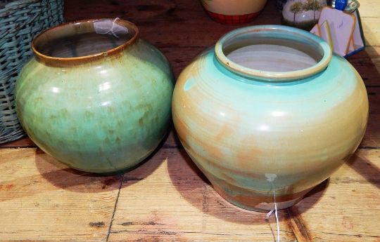 1946 Prinknash Abbey pottery vase, shouldered and tapering in mottled turquoise and brown glaze, dated to the base and another similar Prinknash vase and a basket