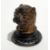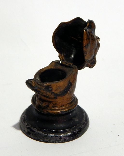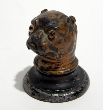 A Victorian painted metal pug inkwell with glass eyes, on circular foot