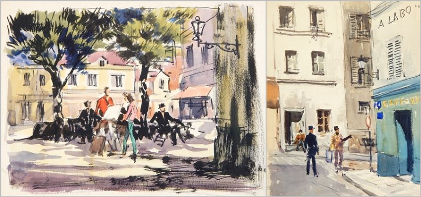 Harry Riley (1895-1966) Watercolour drawings "Montmartre", 49cm x 39cm "Marketplace", 38cm x 50cm (2) Live Bidding: If you would like a condition report on this lot, please contact us at info@cotswoldauction.co.uk or 01242 256363