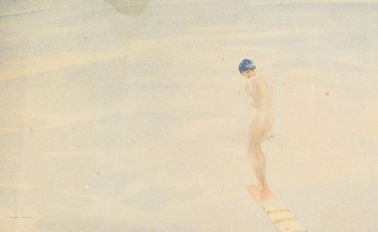 Sir William Russell Flint (1880-1969) Colour lithograph "The Bather", nude girl on a diving board, signed in pencil, "Fine Art A*VBS*N Trade Guild", 28cm x 44cm Live Bidding: Foxed and with two tears, small creases to the body of the print, faded