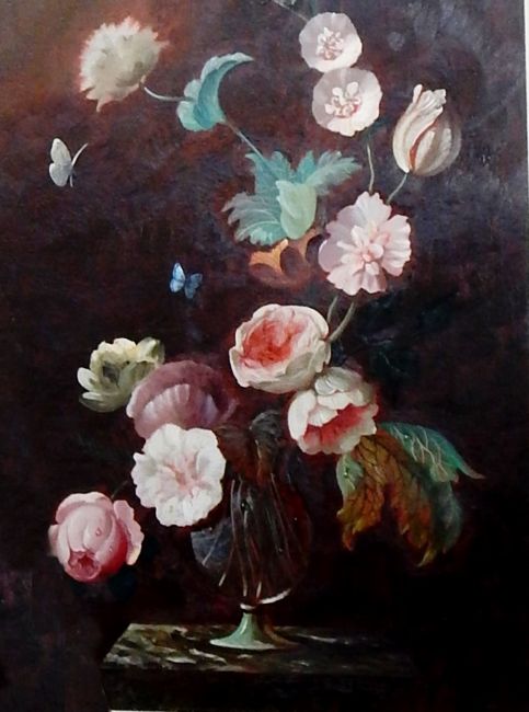 20th century school Oil on board Still life of flowers in vase with butterfly, signed indistinctly, 55cm x 40cm Live Bidding: If you would like a condition report on this lot, please contact us at info@cotswoldauction.co.uk or 01242 256363