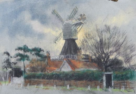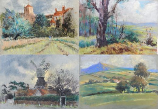 Harry Riley (1895-1966) Pastels "Rolling Landscape", 37cm x 51cm, unframed "Towards the Downs, Box Hill", 40cm x 50cm, unframed "The Windmill, Wimbledon Common", signed and dated verso 1950, 38cm x 51cm, unframed and another (4) Live Bidding: If you would like a condition report on this lot, please contact us at info@cotswoldauction.co.uk or 01242 256363