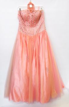 Prom dresses, one turquoise, full net and satin skirt with stiff petticoats, strapless bodice embroidered heavily with star sequins, bugle beads, etc. and coming down onto the net skirt and a similar one in apricot with apricot sequins and a net scarf, both dresses with labels by Yves of London, apparently unworn (2) Live Bidding: If you would like a condition report on this lot, please contact us at info@cotswoldauction.co.uk or 01242 256363