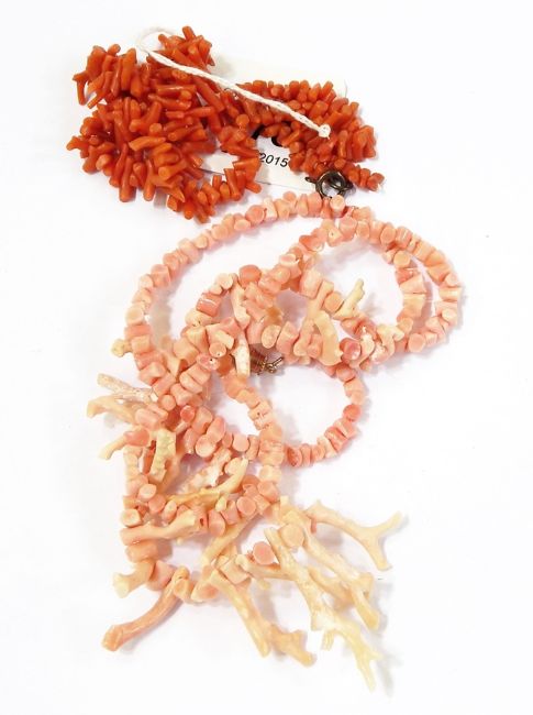 Pale pink long coral necklace and small dark pink branch coral necklace Live Bidding: If you would like a condition report on this lot, please contact us at info@cotswoldauction.co.uk or 01242 256363