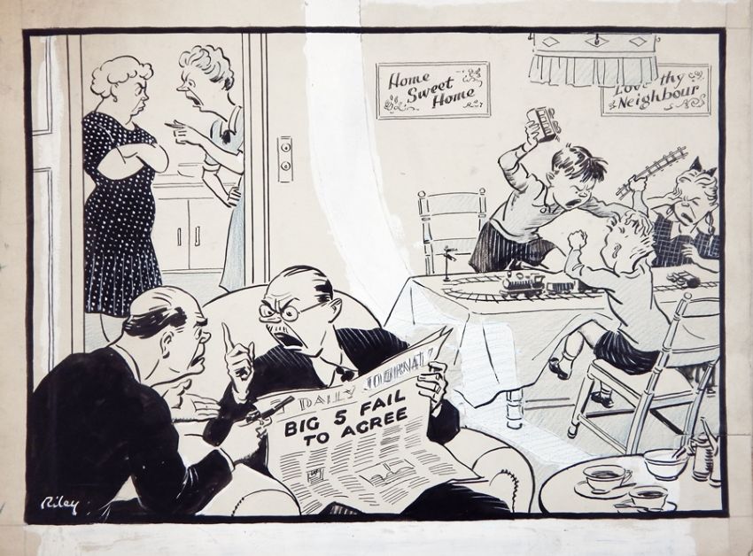 Harry Riley (1895-1966) Pen and ink cartoons "Oi'm Fed Up wi' this Country! Ow about emigrating Sarge!", unframed and four other pen and ink cartoons, all unframed (5) Live Bidding: If you would like a condition report on this lot, please contact us at info@cotswoldauction.co.uk or 01242 256363