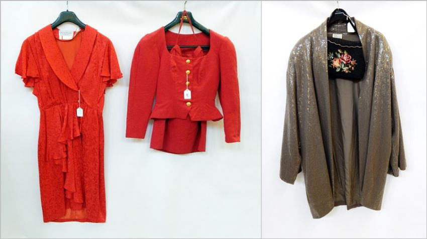 Anne Klein & Co, New York mushroom coloured sequinned jacket, beaded floral black evening purse, Lorcam Mullany for Ronald Joyce red silk dress (marked size 10) and a red jacket, gold coloured buttons and matching skirt