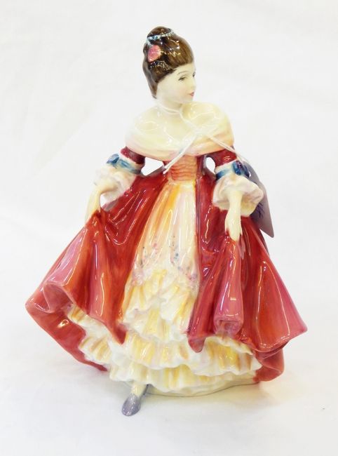 Royal Doulton china figure "Southern Belle" HN2229, 20cm high, Royal Doulton china figure "Top O' The Hill" HN1834 and Royal Doulton china figure "Delphine" (3) Live Bidding: If you would like a condition report on this lot, please contact us at info@cotswoldauction.co.uk or 01242 256363. Please note this lot has not been tested under UV light.