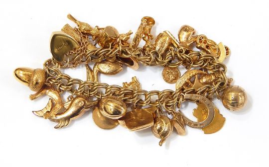 9ct gold charm bracelet having padlock clasp together with 27 various charms Live Bidding: If you would like a condition report on this lot, please contact us at info@cotswoldauction.co.uk or 01242 256363