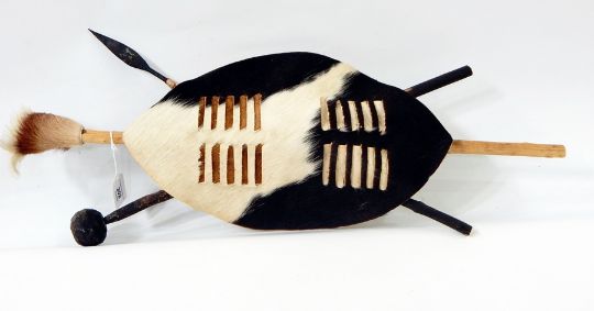 Zulu shield, hide covered with knobkerry and spear attached
