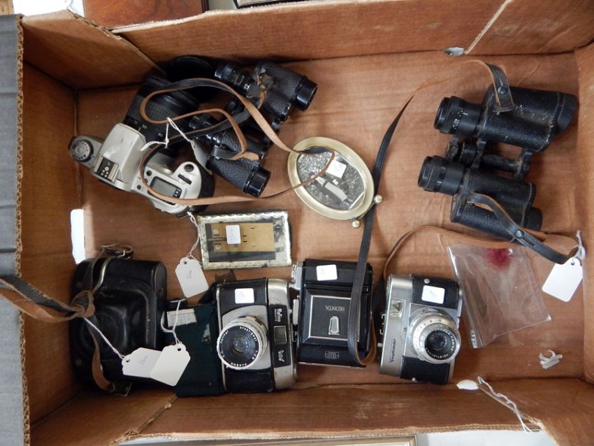 Voigtlander Vito B camera, Zeiss Ikonta folding camera, Halina camera, two pairs of binoculars and other related items
