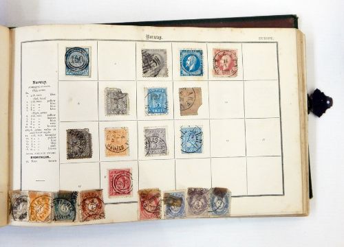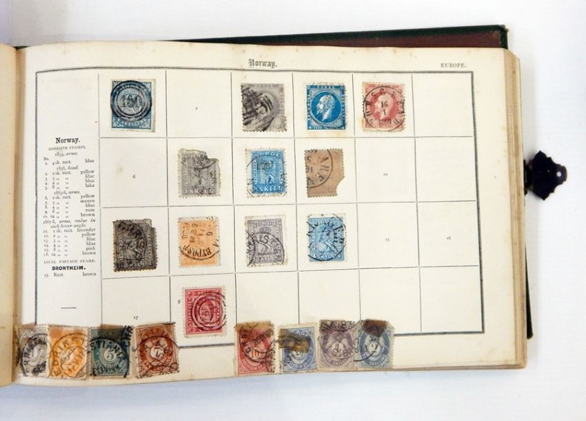 Stafford Smith stamp album with a good selection of early world stamps, mixed condition, many stuck down and defects on up to 10%, classic issues, eg. two 1d blacks, etc.