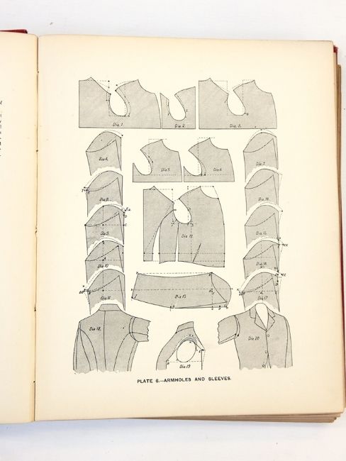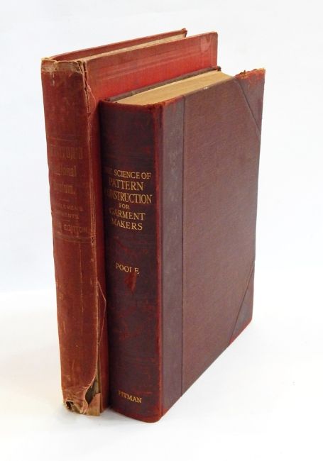 Poole, B W "The System of Pattern Construction for Garment Makers", 2nd edition, pub. Sir Isaac Pitman & Sons, London 1936, half-bound maroon leather over maroon cloth, gilt titling to spine, illustrated throughout, black and white line drawing Thornton, J P "The Sectional System of Gentleman's Garment Cutting comprising coats, vests, breeches, trousers and C", 3rd edition (revised and enlarged), pub. Minister & Co, red cloth, gilt titling to front and spine, illustrated throughout with pattern plates and line drawings (2) Live Bidding: Science of Pattern Construction - damage to leather on spine, bumping to corners, some separation between front free end paper and text block Thornton's Sectional System - splitting to cloth down both sides of spine, bumping to top and bottom of spine and corners, water stain to front cover. Text block shaky, some mould and damp staining to back board, signed to front free end paper, splitting along end papers