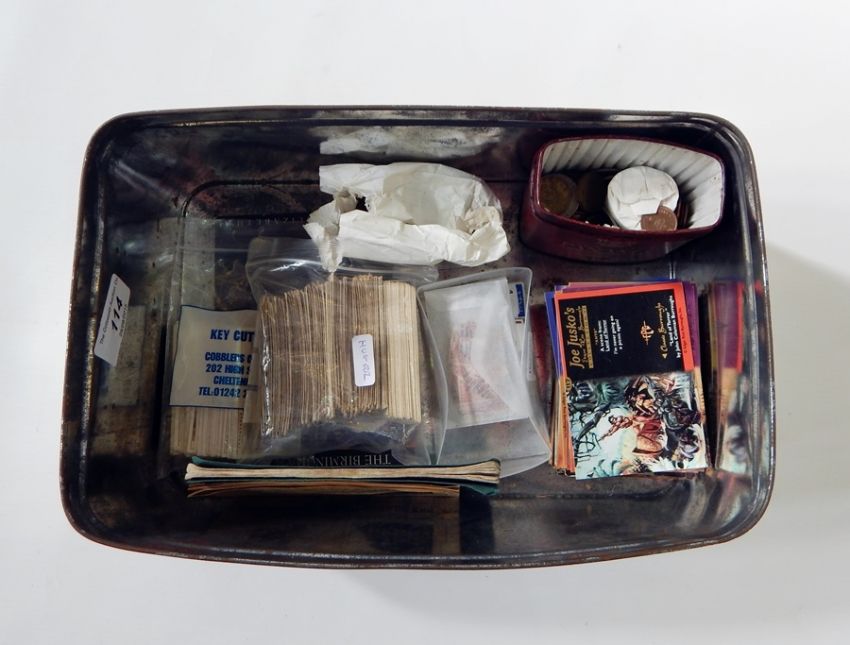 Quantity sundry cigarette cards, collectors cards and coins