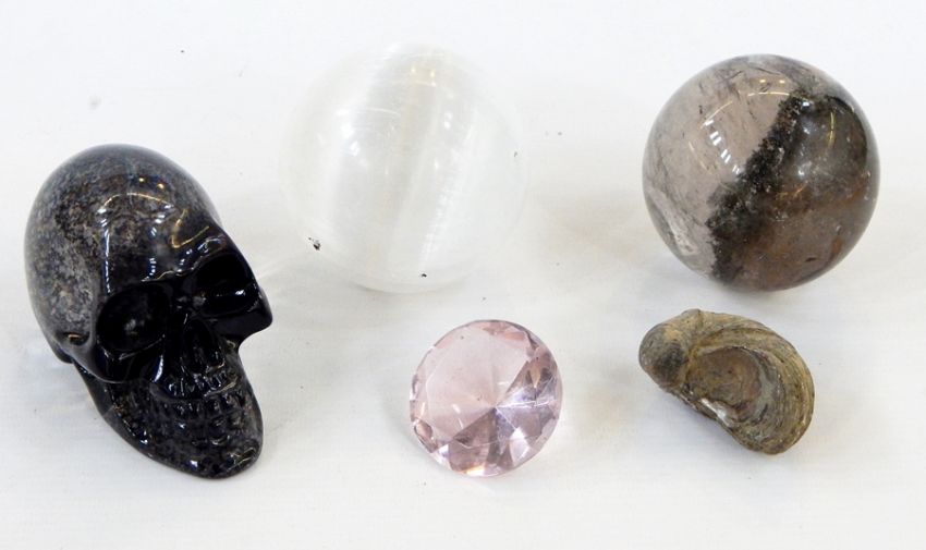 A selenite sphere glass skull, a mossy quartz sphere and other items