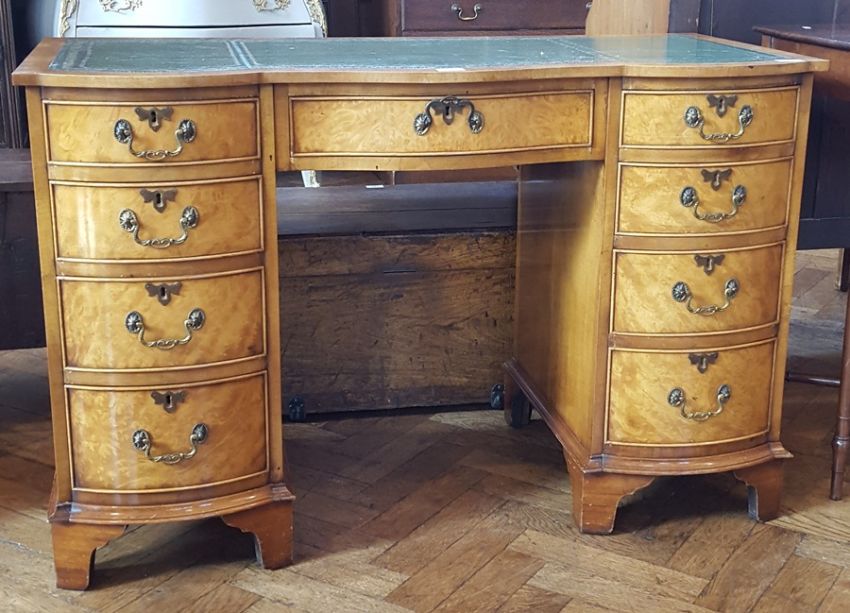 Georgian style walnut kneehole desk with inset leather writing surface, frieze drawer, flanked by four bowfront short drawers to either side, on bracket feet, width 115cm