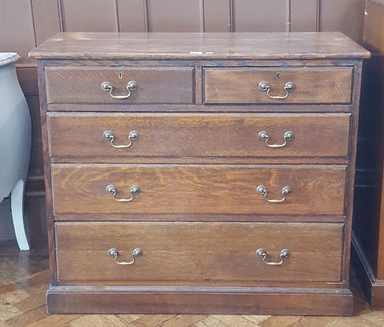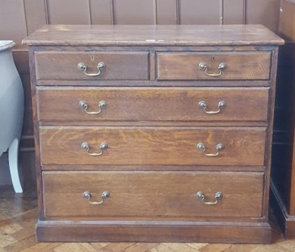 19th century oak chest of drawers of two short and three graduating drawers, swan neck handles