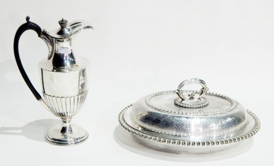 Silver plated pedestal hot water jug, entree dish and other items (1 box)