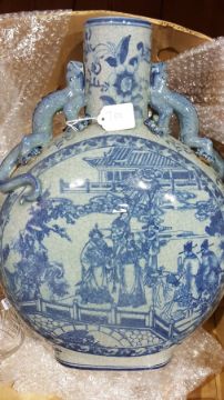 Reproduction Oriental blue and white large moon flask with serpent handle and brandy glass