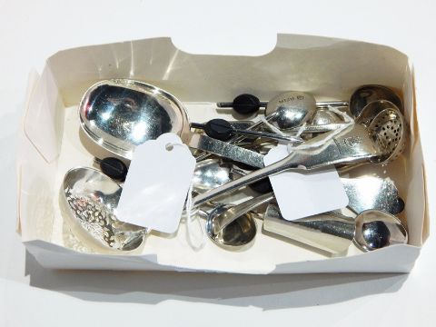 Collection of small silver items to include fiddle pattern sifter spoon, coffee bean spoons, trifid finial spoon, etc., 6oz approx.