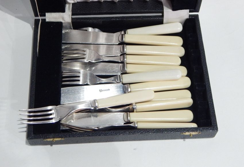 Quantity various plated table flatware including soup ladle and fish knives and forks (1 box)