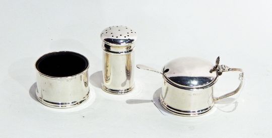 Early 20th century silver condiment set of straight sided cylindrical form comprising pepperette, salt and mustard with spoon, Chester 1923, 3oz approx. (without blue glass liners)