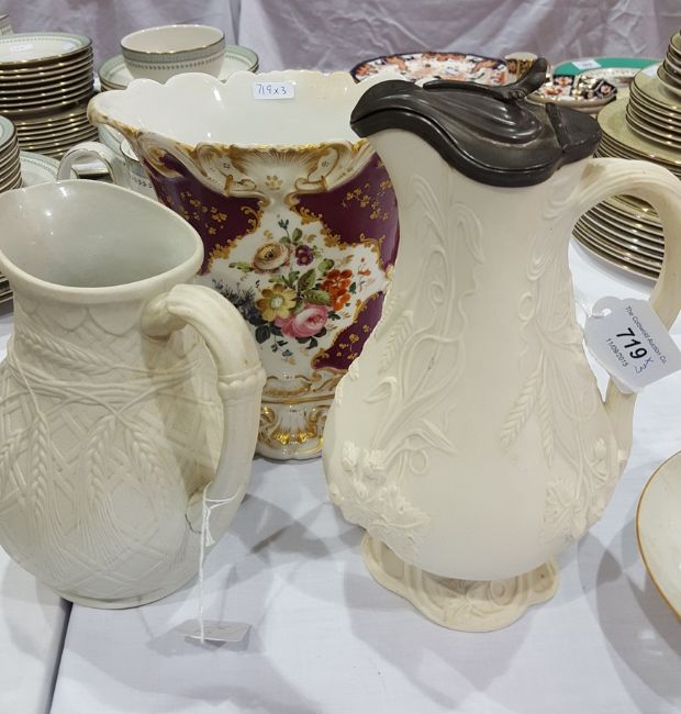 Victorian jug, fruiting vine and wheat ear decorated with pewter mounts, another "Barley Corn" pattern and Victorian china vase, floral painted
