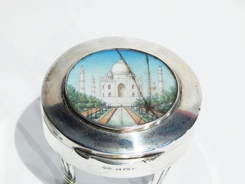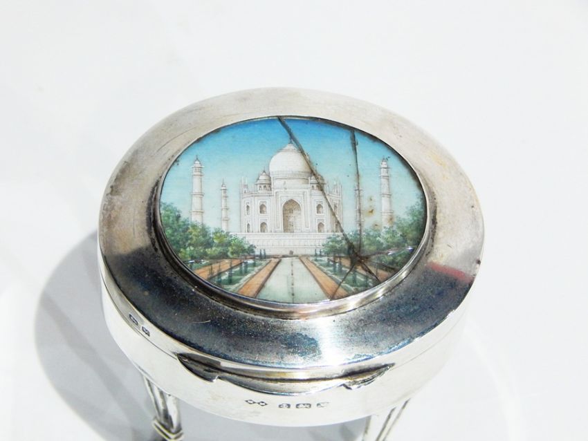 Silver, blue enamel and glass trinket box inscribed 'M', width 6cm together with an oval silver jewellery box, raised on tapering legs with paw feet, the hinged cover inset with a panel depicting the Taj Mahal, Birmingham 1920, width 7cm (2)