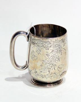Victorian silver christening mug of ovoid form with engraved ivy leaf and butterfly decoration, London 1886, 3.5oz approx., 9cm high