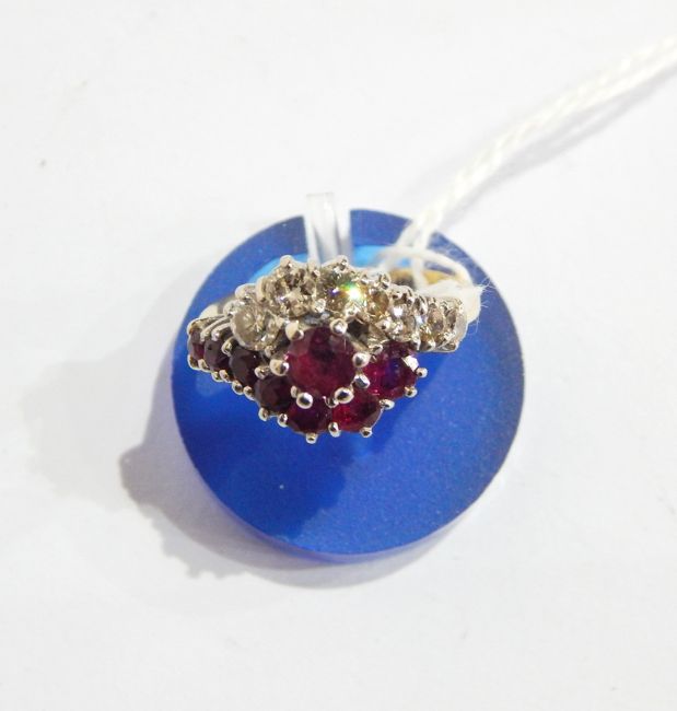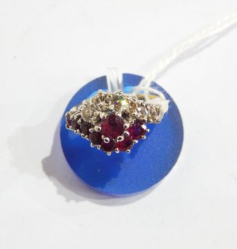 18ct gold, diamond and ruby ring, the central brilliant cut ruby flanked by asymmetric graduated raised rubies and diamonds to opposite sides