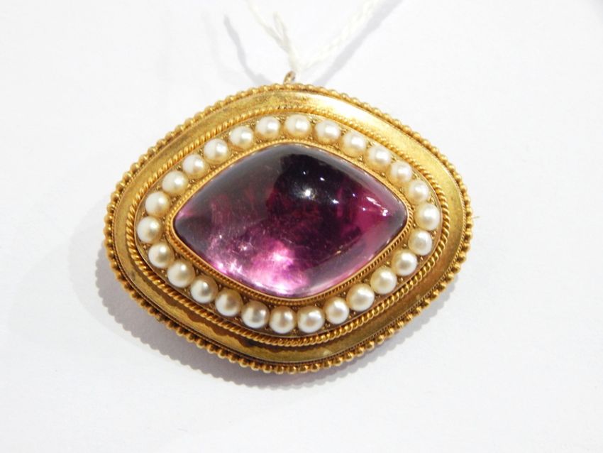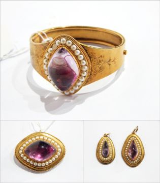 Victorian suite of seedpearl and amethyst-coloured jewellery to include bangle, brooch and pendant, each of lozenge-shape surrounded by pearls, in rope-twist and bead setting, the bangle with engraved shoulders