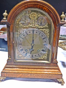 Victorian oak and gilt brass bracket clock, silver chapter ring with Roman and Arabic numerals having subsidiary dials of slow/fast and chime/silent above with applied gilt sun motif and foliate spandrels to face, 8-day twin fusee and twin gong striking movement marked W & H Sch. for Winterhalder & Hofmeier School , 47cms high