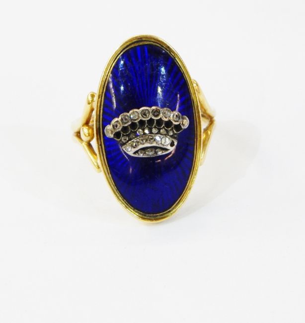 Victorian enamel, diamond and gold-coloured metal ring, oval with royal blue enamel ground surmounted by rose cut diamond set coronet, pierced scroll shoulders to the double shank