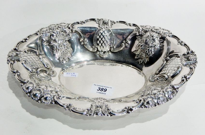 Edwardian silver oval dish of repousse and pierced decoration, Birmingham 1903, 30cm wide, 10oz approx.