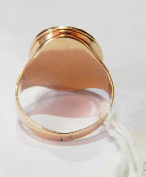 19th century carved hardstone and gold-coloured metal cameo ring, the oval beige and cream hardstone cameo carved with lion