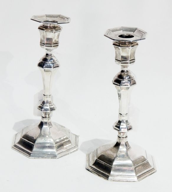 Matched pair of candlesticks, London mark (marks worn) with tapered and fluted stem, on splayed octagonal base