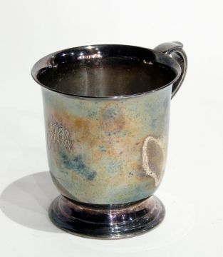 Silver christening mug with flared rim, scroll handle, raised on circular foot, Sheffield 1959, 4oz approx., height 7.5cm