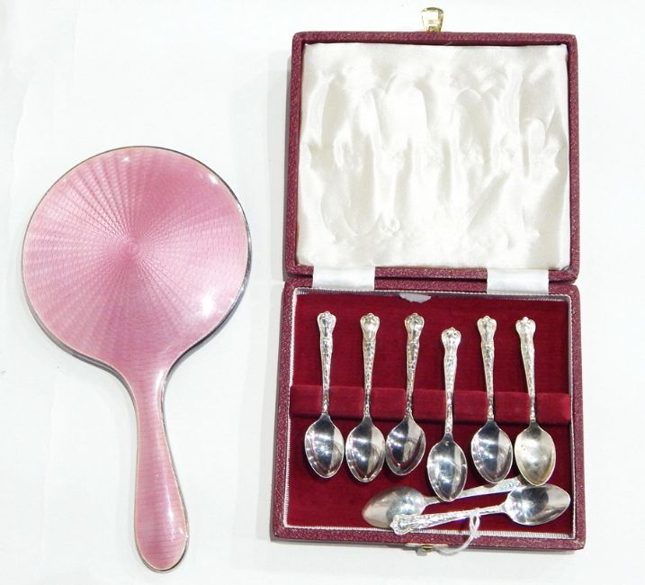 Silver and pink enamel mirror, Birmingham assay and 1938 George VI set of coffee spoons with scroll and scale handles
