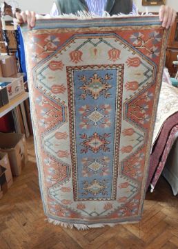 Wool rug with pale blue ground, shaped lozenge medallions and stylised floral border, 137cm x 77cm