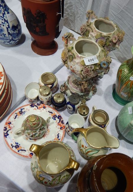 Crown Devon "Fielding" pottery jug and vase, stylised floral branch decorated with gilt borders, quantity Imari decorated ceramic condiments, pair Dresden style floral encrusted vases on bases (af), Canton miniature teapot and other ceramics