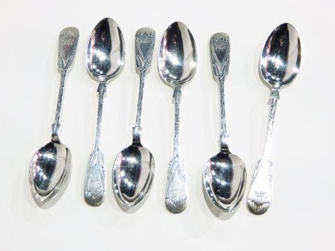 Set of six Victorian fiddle pattern teaspoons with bright-cut engraving, Exeter 1879, 3oz approx.