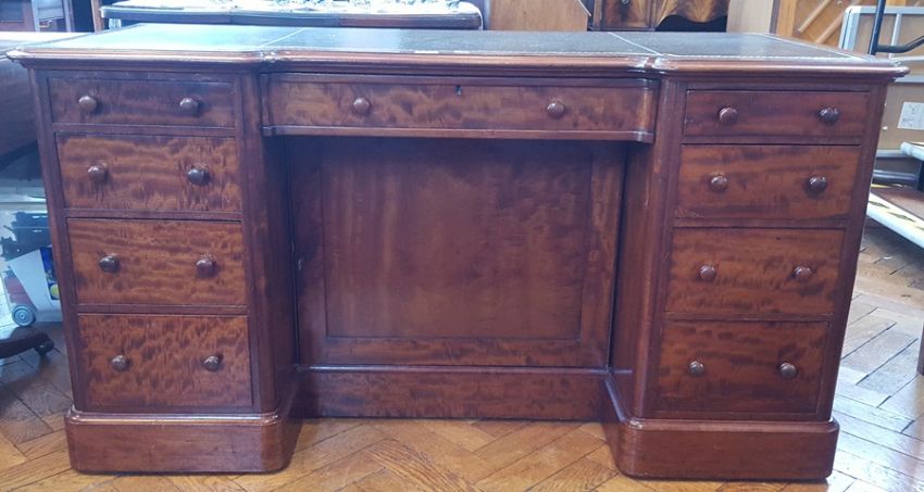 Victorian flame-mahogany kneehole desk with inset leather writing surface, frieze drawer, cupboard, flanked by four short drawers to either side, on plinth base, width 141cm