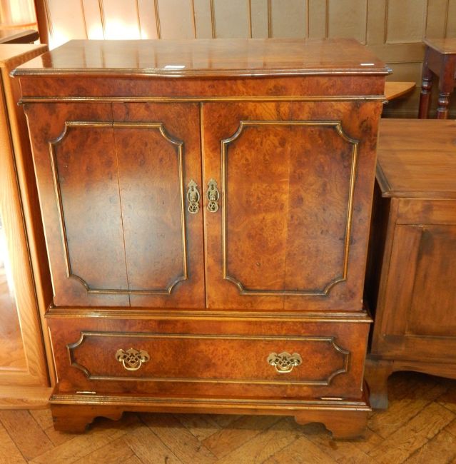 A Georgian style burr walnut television cabinet, the pair of double hinged doors opening to reveal television space with hinged drawer below, raised on bracket feet, width 78cm