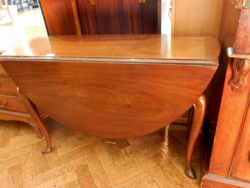 A Georgian style mahogany oval top drop flap dining table, on carved cabriole legs with pointed pad feet, width 110cm