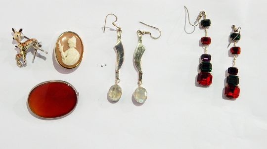 Silver and cornelian oval brooch, pair moonstone pendant earrings, dress ring decorated with the archer, enamelled deer brooch and other jewellery items
