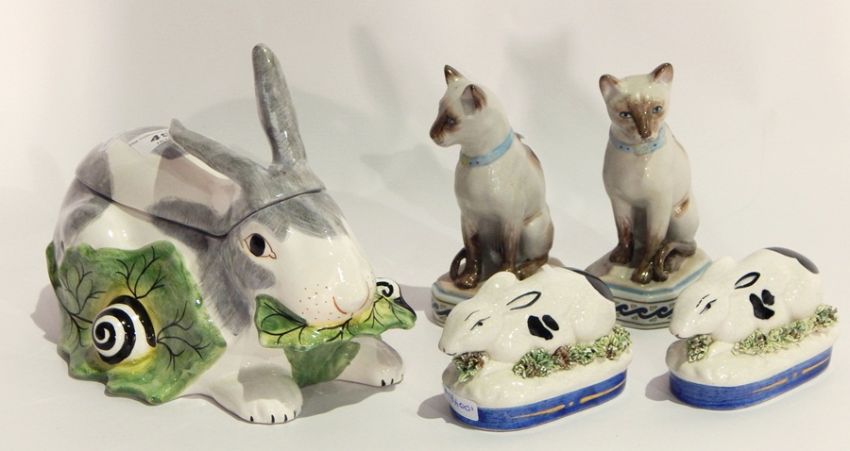 Italian pottery rabbit pattern tureen and cover, 23cm long, pair ceramic models of cats and a pair reproduction Staffordshire style model rabbits (5)